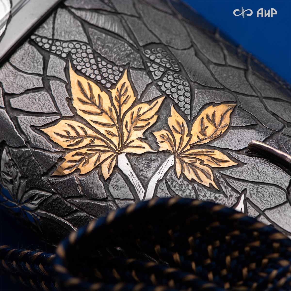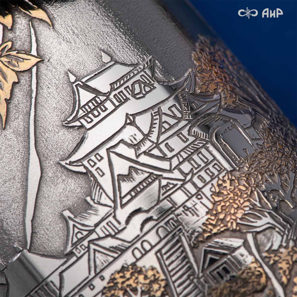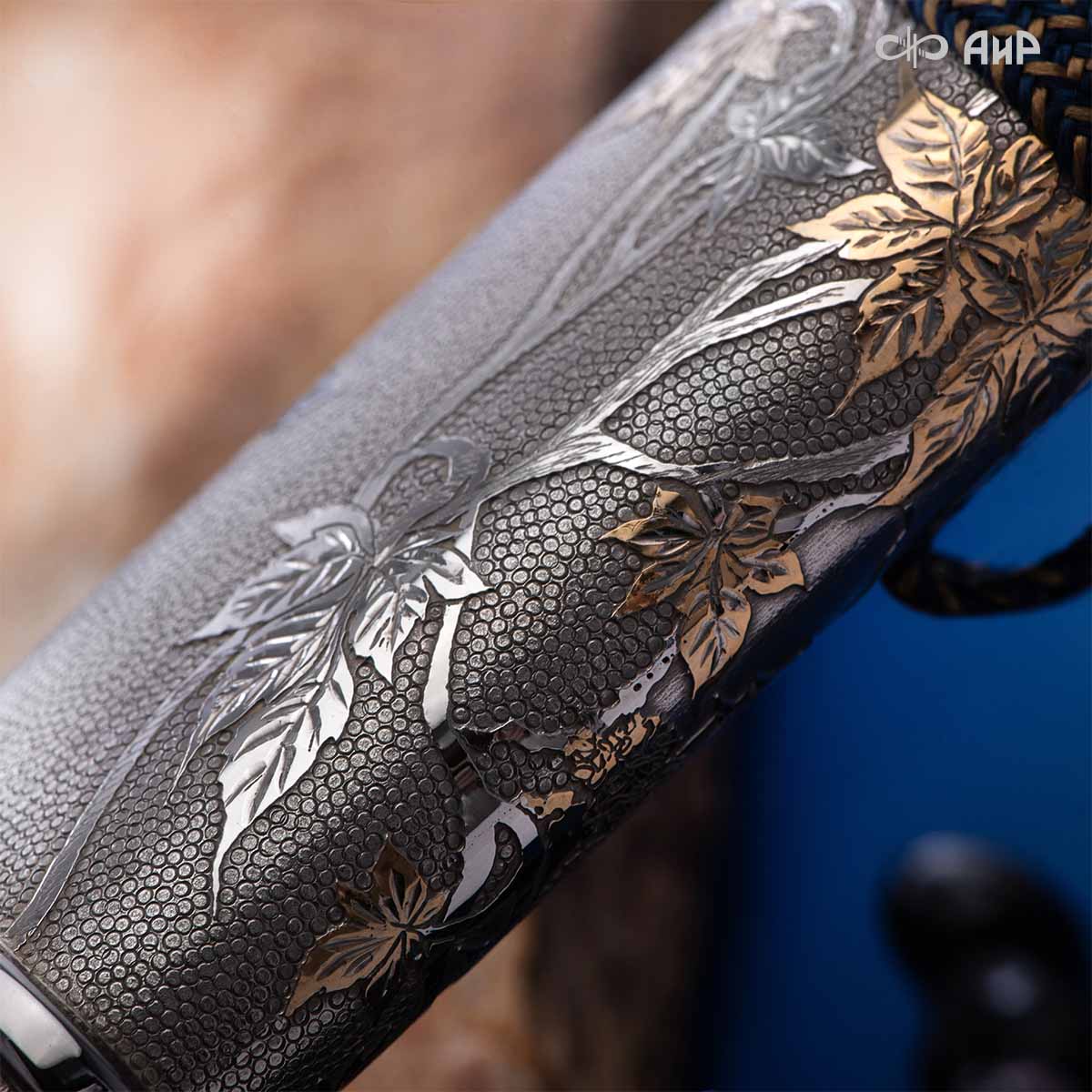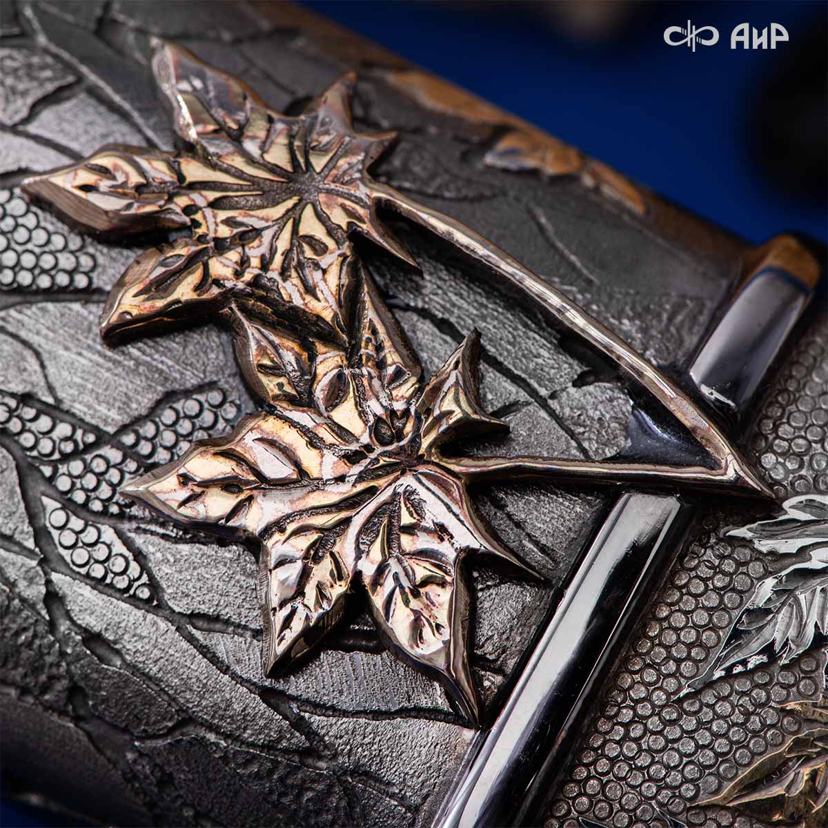 Глубоко пропустив через себя эту притчу, мастера «АиР» создали поистине произведение оружейного искусства. Клинок из дамасской стали ZLADINOX ZDI-1016 у основания украшен мокуме гане. Рукоять и цельнометаллические ножны символизируют собой подлунный мир, в котором красота может быть такой хрупкой, с одной стороны, а с другой стороны – способна смягчить сердце императора-самурая. Танто изысканно украшен тонкими резными кленовыми листочками золотистого и серебристого цвета. Весь фон рукояти и ножен богато проработан для придания различной фактуры, напоминающей и землю, и камни, и ковер из листьев, и пепел. На ножнах тщательно прорисован дворец мудрого правителя в обрамлении кленовых ветвей. При одном только взгляде на танто замирает сердце и становится понятно, почему японский народ умеет ценить совершенство оружия и созерцать бесконечную красоту окружающей природы.