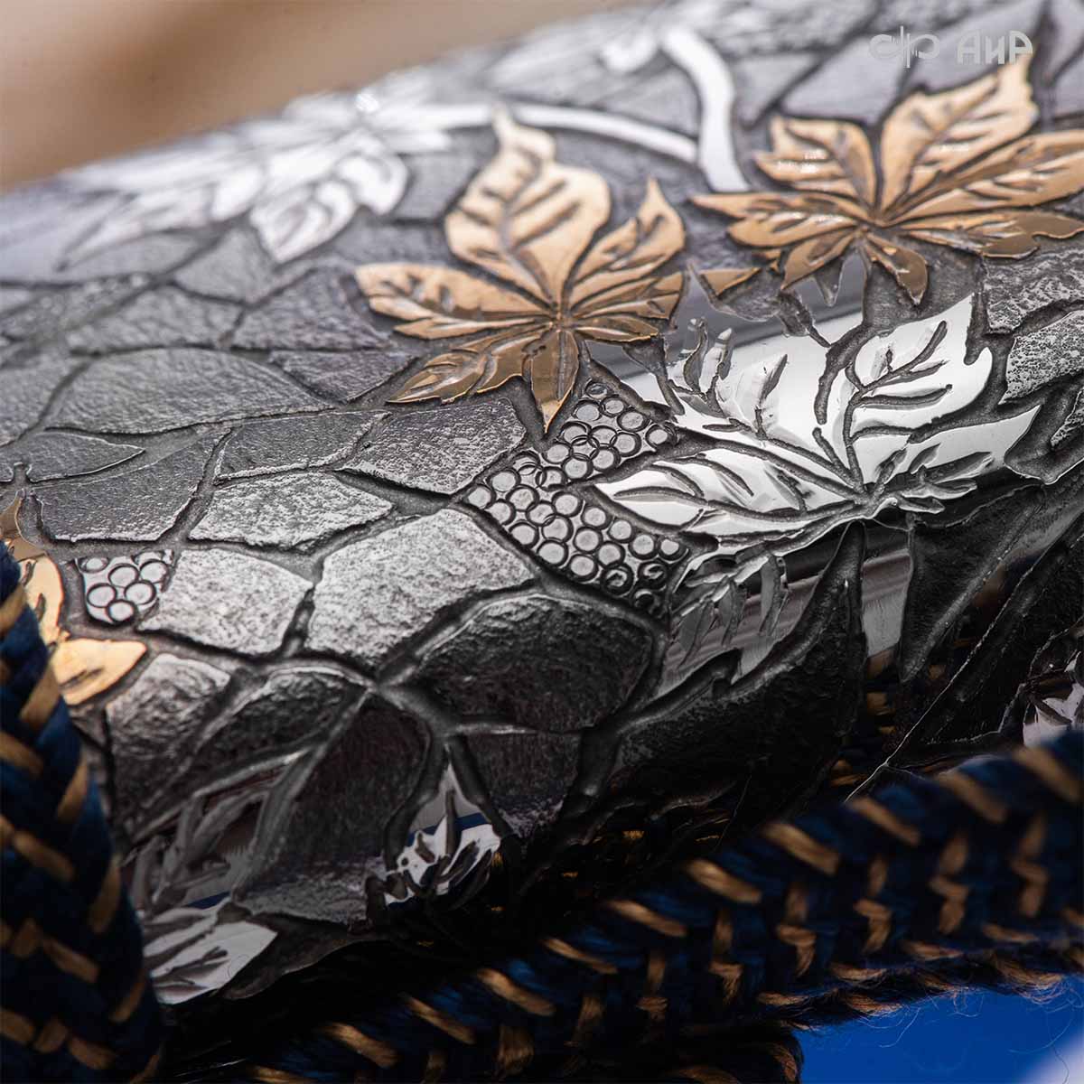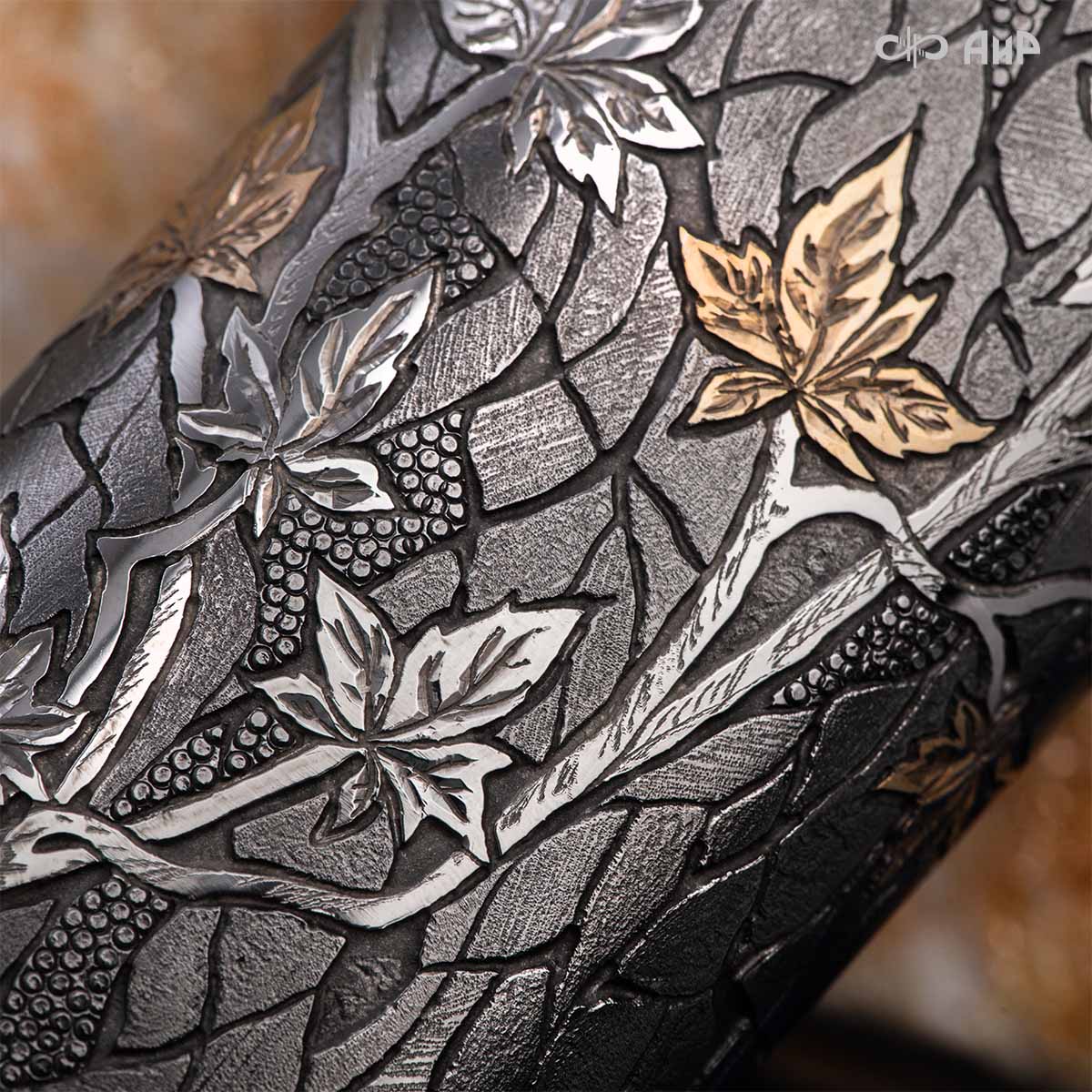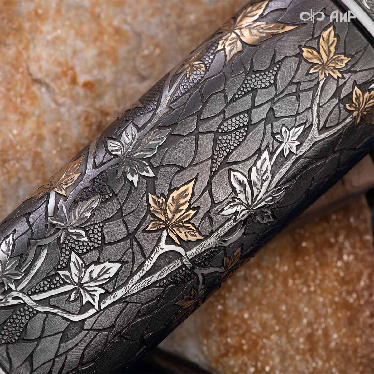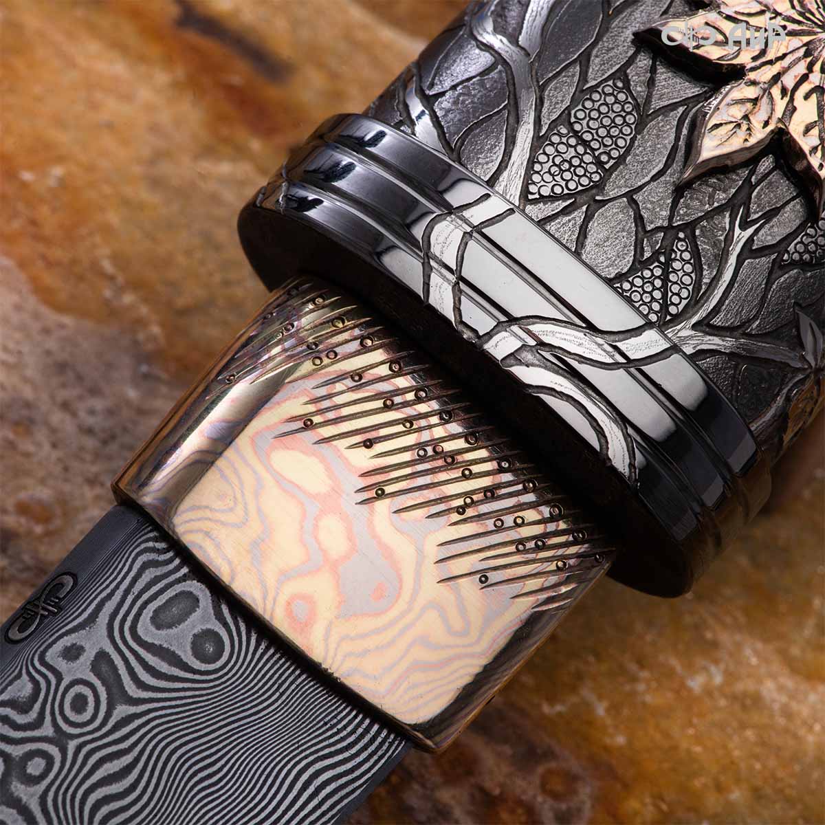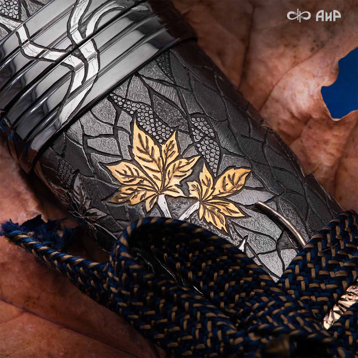 Глубоко пропустив через себя эту притчу, мастера «АиР» создали поистине произведение оружейного искусства. Клинок из дамасской стали ZLADINOX ZDI-1016 у основания украшен мокуме гане. Рукоять и цельнометаллические ножны символизируют собой подлунный мир, в котором красота может быть такой хрупкой, с одной стороны, а с другой стороны – способна смягчить сердце императора-самурая. Танто изысканно украшен тонкими резными кленовыми листочками золотистого и серебристого цвета. Весь фон рукояти и ножен богато проработан для придания различной фактуры, напоминающей и землю, и камни, и ковер из листьев, и пепел. На ножнах тщательно прорисован дворец мудрого правителя в обрамлении кленовых ветвей. При одном только взгляде на танто замирает сердце и становится понятно, почему японский народ умеет ценить совершенство оружия и созерцать бесконечную красоту окружающей природы.