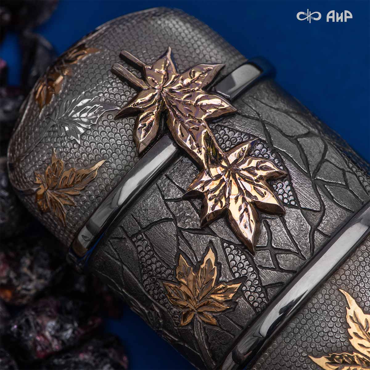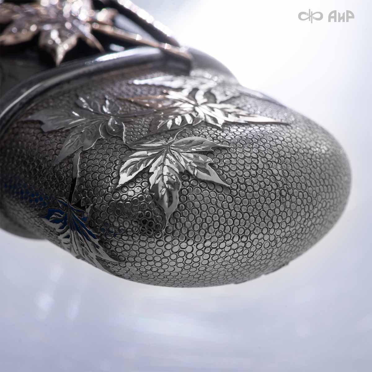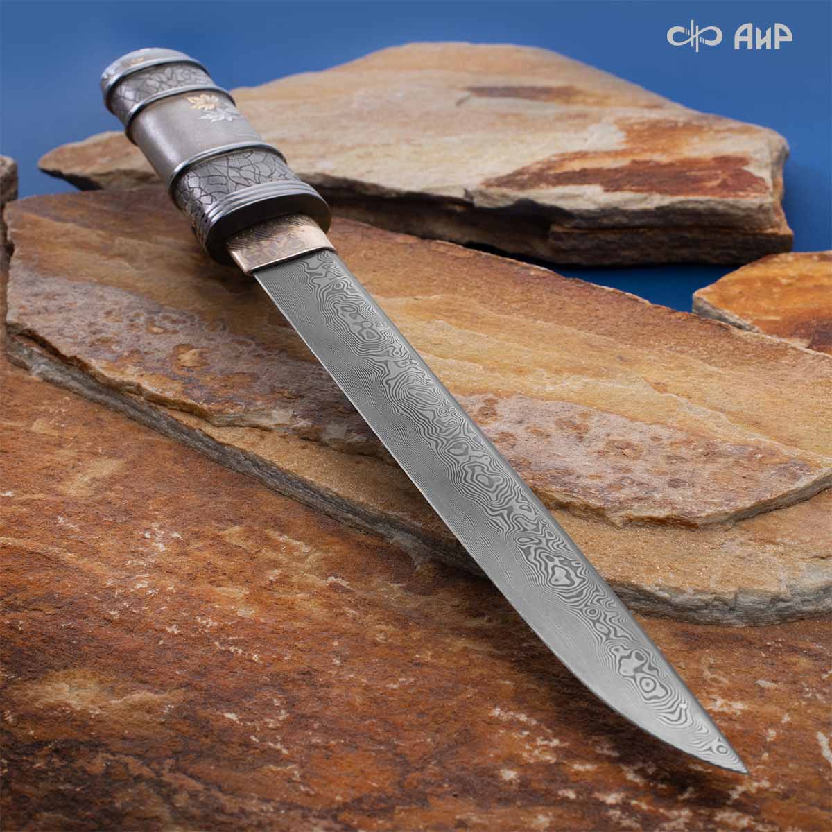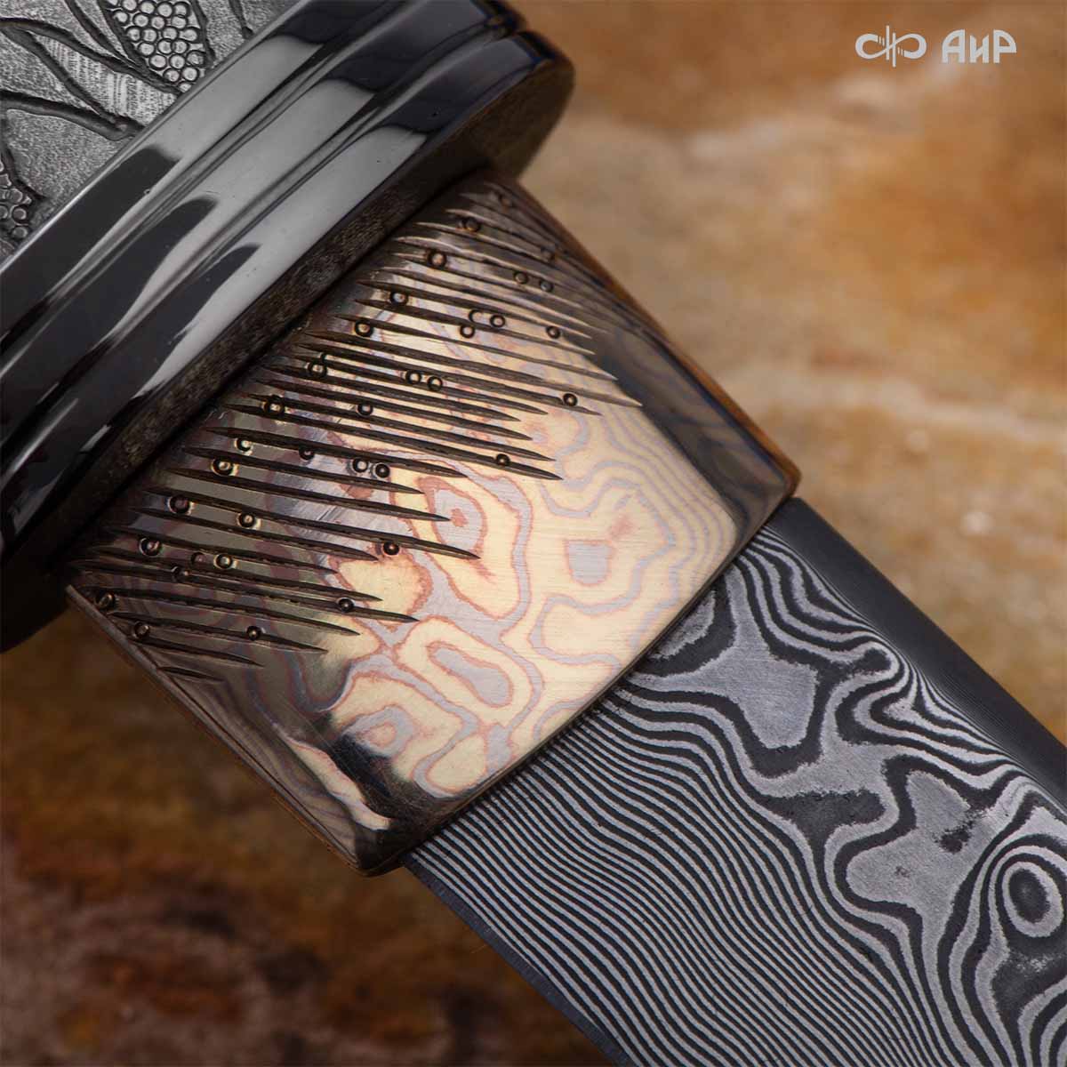 Глубоко пропустив через себя эту притчу, мастера «АиР» создали поистине произведение оружейного искусства. Клинок из дамасской стали ZLADINOX ZDI-1016 у основания украшен мокуме гане. Рукоять и цельнометаллические ножны символизируют собой подлунный мир, в котором красота может быть такой хрупкой, с одной стороны, а с другой стороны – способна смягчить сердце императора-самурая. Танто изысканно украшен тонкими резными кленовыми листочками золотистого и серебристого цвета. Весь фон рукояти и ножен богато проработан для придания различной фактуры, напоминающей и землю, и камни, и ковер из листьев, и пепел. На ножнах тщательно прорисован дворец мудрого правителя в обрамлении кленовых ветвей. При одном только взгляде на танто замирает сердце и становится понятно, почему японский народ умеет ценить совершенство оружия и созерцать бесконечную красоту окружающей природы.