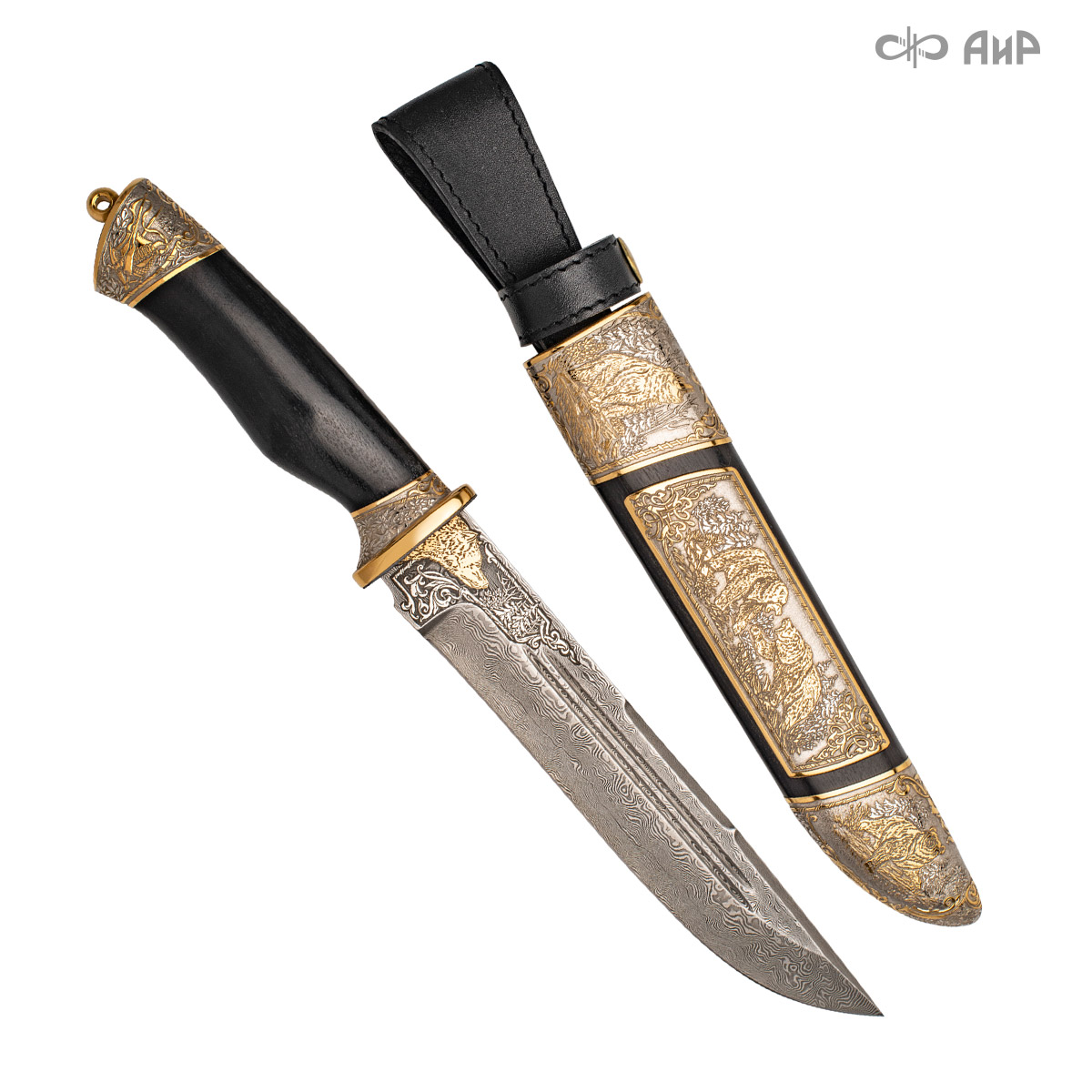 Опытные оружейники и художники Компании «АиР» учитывают особенности оружия, соразмеряя его украшение и практическое назначение ножа. Для охотников и туристов характерен некоторый консерватизм в восприятии художественных достоинств ножей. Поэтому излюбленными и наиболее удачными приемами украшения таких ножей остаются классические охотничьи мотивы, а разнообразие оформительских вариантов достигается за счет различных техник – травления, золочения, гравировки, то есть полного набора приемов создания златоустовской гравюры на металле.